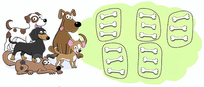 15 bein skal deles likt på 5 hunder. Hvor mange bein får hver hund?