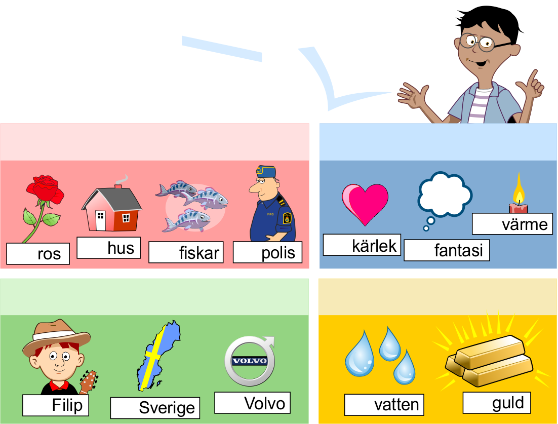 Substantiv är ord för saker, djur, växter, människor, ämnen, känslor och namn.